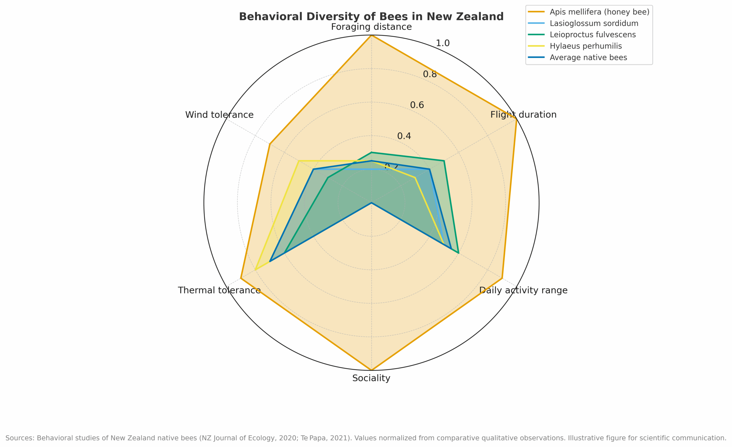 This radar chart here after illustrates the comparative behavioral diversity among honey bees (Apis mellifera) and several native bee species in New Zealand, including Lasioglossum sordidum, Leioproctus fulvescens, and Hylaeus perhumilis.